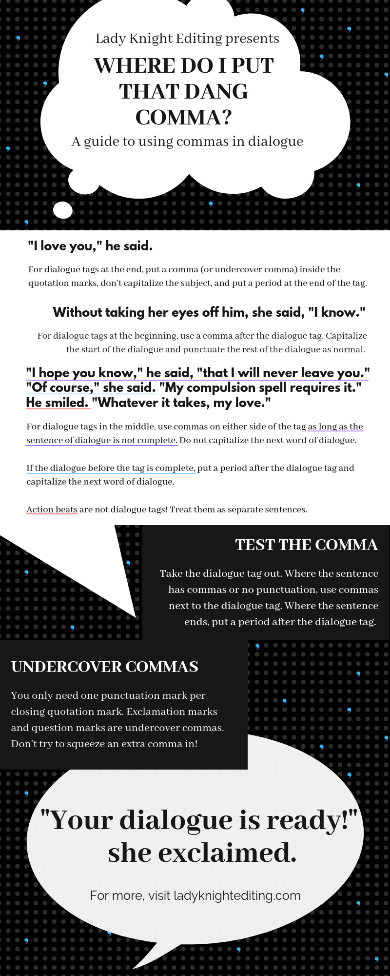 Remember that a dialogue tag can’t stand on its own. It always needs a comma (even an undercover one). If you’re not sure whether to use a comma or a period, take the dialogue tag out and see how the sentences fall. And then refer to my handy infographic for all your punctuation needs!
